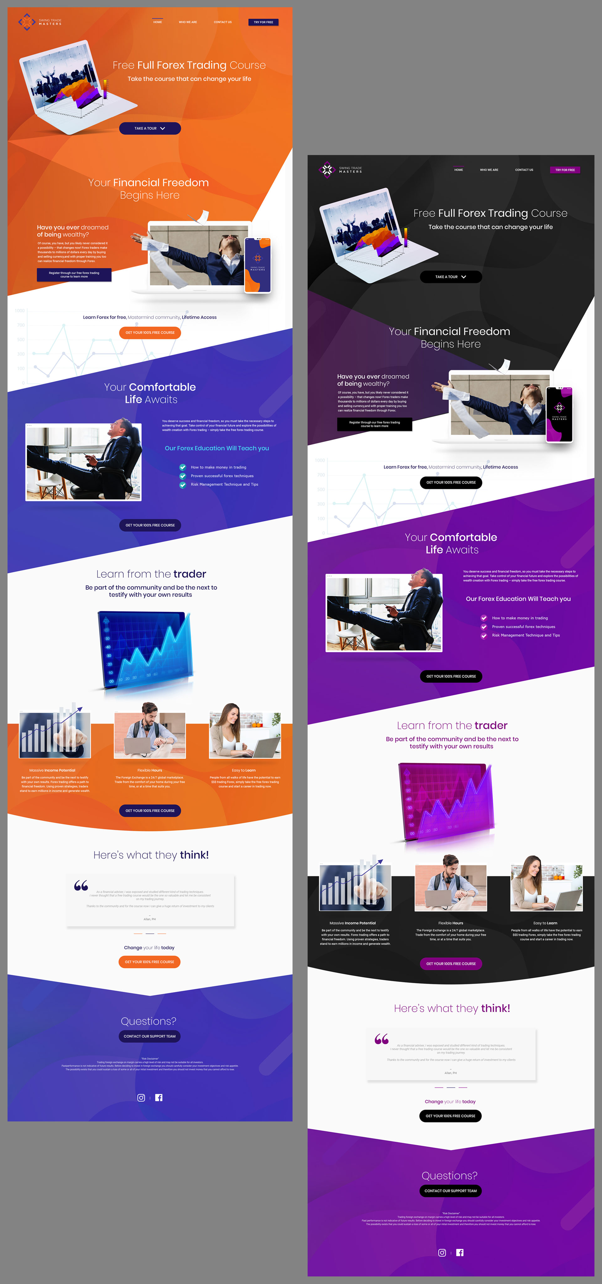 The designs are proposed parallax style design for a client Swing Trade Masters. It has two color variants theme the orange-blue theme and the black-violete theme style.
